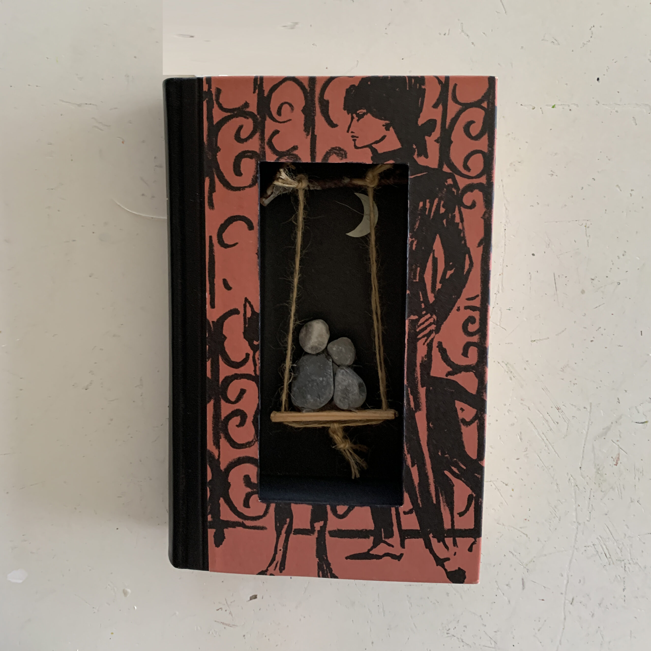 Ranunkeln aus T-Shirt, Regenbogen-Windspiel, Reissverschluss-Stein und Rose im Buch